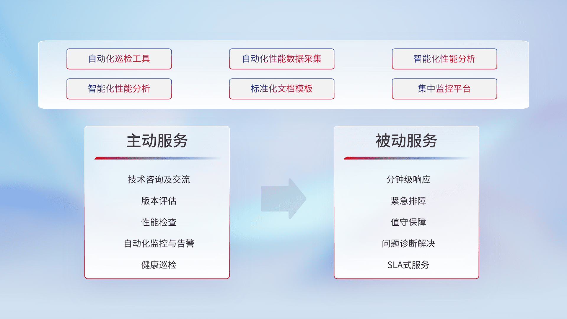 智能化工具和标准化文档,,,保障服务质量,,,提供主动服务(包含技术咨询、、、、版本评估、、、、性能检查、、、自动化监控与告警、、健康巡检)和被动服务包含(分钟级响应、、、、紧急排障、、值守保障、、问题诊断解决、、SLA服务)。。